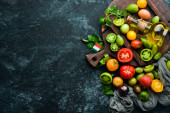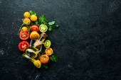 Zdjęcie "Surowy zielony makaron z pomidorami, olejem i pietruszką na białym drewnianym tle. Włoska tradycyjna kuchnia. Świeże warzywa. Widok góry. Wolne miejsce na tekst." może być wykorzystywane do celów osobistych i komercyjnych zgodnie z warunkami zakupionej licencji Royalty-free. Obraz jest dostępny do pobrania w jakości wysokiej rozdzielczości do 5760x3840.