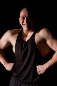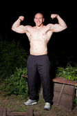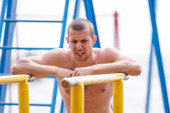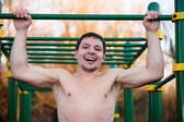 szczęśliwy młody człowiek skręcanie na pierścienie żelaza