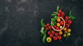 Suchy makaron z kolorowym olejem pomidorowym i pietruszką. Włoska tradycyjna kuchnia. Świeże warzywa. Widok góry. Wolne miejsce na tekst.
