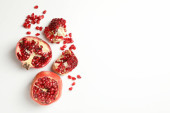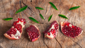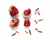 plasterki granatu i zielone liście odizolowane na białym tle