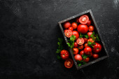 Kolorowe pomidory ze słoikiem oleju w drewnianym pudełku. Na czarnym kamiennym tle. Widok góry. Wolne miejsce na tekst.