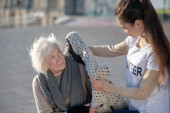 Ciemnowłosa wolontariuszka przynosząca ciepłe ubrania i darowizny