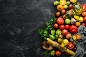 Zdjęcie "Warzywa. Świeże kolorowe pomidory na czarnym kamiennym tle. Widok góry. Wolne miejsce na tekst." może być wykorzystywane do celów osobistych i komercyjnych zgodnie z warunkami zakupionej licencji Royalty-free. Obraz jest dostępny do pobrania w jakości wysokiej rozdzielczości do 5760x3840.