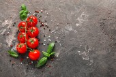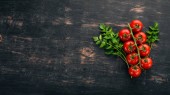 Świeże czerwone pomidory na białym drewnianym tle. Zieloni. Widok góry. Wolne miejsce na tekst.