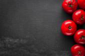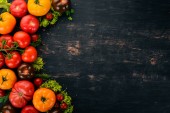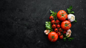 Świeże czerwone pomidory na białym drewnianym tle. Zieloni. Widok góry. Wolne miejsce na tekst.