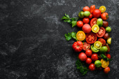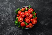 Zdjęcie "Świeże czerwone pomidory na białym drewnianym tle. Zieloni. Widok góry. Wolne miejsce na tekst." może być wykorzystywane do celów osobistych i komercyjnych zgodnie z warunkami zakupionej licencji Royalty-free. Obraz jest dostępny do pobrania w jakości wysokiej rozdzielczości do 5760x3840.