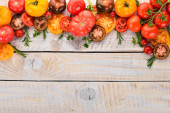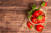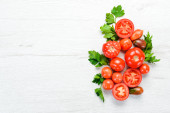 Świeże czerwone pomidory na białym drewnianym tle. Zieloni. Widok góry. Wolne miejsce na tekst.