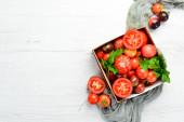 Zdjęcie "Świeże czerwone pomidory na białym drewnianym tle. Zieloni. Widok góry. Wolne miejsce na tekst." może być wykorzystywane do celów osobistych i komercyjnych zgodnie z warunkami zakupionej licencji Royalty-free. Obraz jest dostępny do pobrania w jakości wysokiej rozdzielczości do 5760x3840.