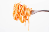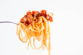 Spaghetti bolognese na widelec na białym tle