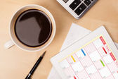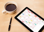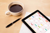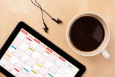 Tablet pc kalendarz wyświetlone na ekranie przy filiżance kawy na d
