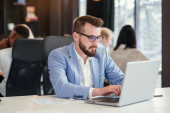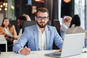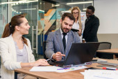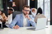 Profesjonalny agent handlowy pracuje na laptopie i konsultingu na telefon komórkowy ze swoim partnerem biznesowym w nowoczesnym centrum kooperacji.