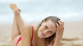 Koncepcja podróży. Atrakcyjna kobieta w bikini na piaszczystej plaży