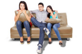 Zdjęcie "trzech młodych przyjaciół walki o pilota" może być wykorzystywane do celów osobistych i komercyjnych zgodnie z warunkami zakupionej licencji Royalty-free. Obraz jest dostępny do pobrania w jakości wysokiej rozdzielczości do 5760x3840.