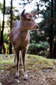 Pionowe zbliżenie dzikich jeleni pachnących skałą, jesienne liście jesieni
