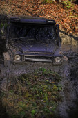 Wędrówki 4x4. Ślady błota. Pojazd terenowy jedzie w góry. Błoto i woda spływają w off road racing. Safari. Offroad. Podróż przygoda. Podróż terenowa górską drogą. Pojazd terenowy