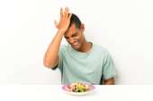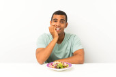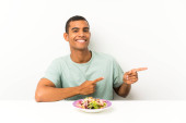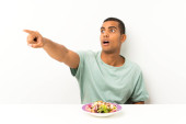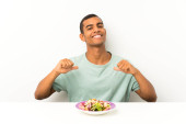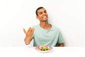 młody przystojny mężczyzna z sałatka w stół co telefon gest