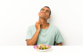 Zdjęcie "Młody przystojny człowiek z sałatką w tabeli przedłużające ręce na bok, aby zaprosić przyjść" może być wykorzystywane do celów osobistych i komercyjnych zgodnie z warunkami zakupionej licencji Royalty-free. Obraz jest dostępny do pobrania w jakości wysokiej rozdzielczości do 5760x3840.