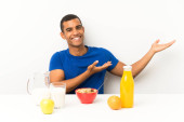 Młody przystojny człowiek z sałatką w tabeli przedłużające ręce na bok, aby zaprosić przyjść