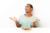 Młody przystojny człowiek z sałatką w stole śmiechem