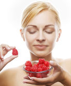 bliska uśmiechający się kobiety w gospodarstwie maliny