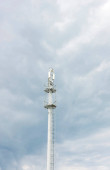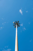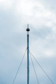 Biegun elektryczny i przewód elektryczny na zachmurzonym i niebieskim niebie.