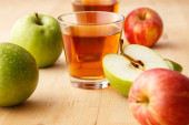 kieliszek soku jabłkowego i zielone jabłka na białym tle o