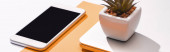 przycięty widok kobiety trzymającej smartfona w pobliżu szablonu projektu strony internetowej, tabletu cyfrowego i zielonej rośliny na beżowym tle