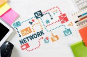 widok z góry gadżety w pobliżu drewnianych bloków z napisem projektu, szablon projektu strony internetowej, notatnik z prototypowania liternictwa i zielona roślina na beżowym tle