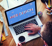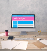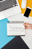 przycięty widok kobiety trzymającej notatnik z napisem web design w pobliżu laptopa, smartfona, myszki komputerowej na abstrakcyjnym tle geometrycznym