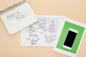 Zdjęcie "górny widok notebooka z prototypowaniem liternictwa, szablonu smartfona i strony internetowej na abstrakcyjnym tle geometrycznym" może być wykorzystywane do celów osobistych i komercyjnych zgodnie z warunkami zakupionej licencji Royalty-free. Obraz jest dostępny do pobrania w jakości wysokiej rozdzielczości do 5760x3840.