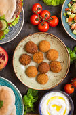 zbliżenie widok falafela z warzywami i sosem na pita pobliżu świeżego hummusu na drewnianym stole