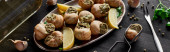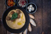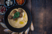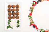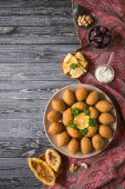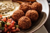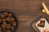 widok z góry kulki falafel z hummus na płycie w pobliżu sztućce na drewnianym stole