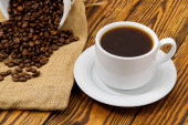 Filiżanka gorącej kawy z palonymi ziarnami kawy rozrzuconymi z worka konopi na drewnianym stole