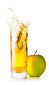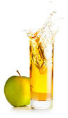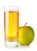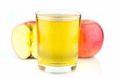 kieliszek soku jabłkowego i zielone jabłka na białym tle o