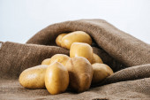 świeże dojrzałe ziemniaki w pudełku na drewnianym tle