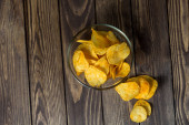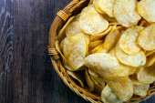 widok z góry pyszne chrupiące chipsy ziemniaczane w wiklinowym koszu na drewnianym stole
