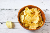 Zdjęcie "widok z góry pyszne chrupiące chipsy ziemniaczane w wiklinowym koszu na drewnianym stole" może być wykorzystywane do celów osobistych i komercyjnych zgodnie z warunkami zakupionej licencji Royalty-free. Obraz jest dostępny do pobrania w jakości wysokiej rozdzielczości do 5760x3840.