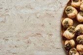 częściowy widok kobiety jedzącej pyszne gotowane ślimaki z pęsetą na tle kamienia