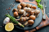 Zdjęcie "widok z góry pyszne gotowane ślimaki z plasterkami cytryny, pietruszka, czarny pieprz i pęseta na kamiennym tle" może być wykorzystywane do celów osobistych i komercyjnych zgodnie z warunkami zakupionej licencji Royalty-free. Obraz jest dostępny do pobrania w jakości wysokiej rozdzielczości do 5760x3840.