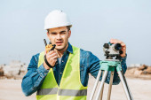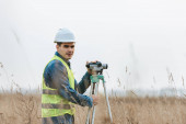 Ankieter w twardej i wysokiej widoczności kurtka patrząc w poziomie cyfrowym