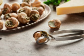 wybiórcze skupienie pysznych gotowanych ślimaków w pobliżu cytryny, parmezan, czosnek, pietruszka, czarny pieprz i pęseta na kamiennym tle
