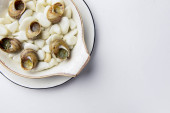 widok z góry pyszne gotowane ślimaki z cytryną na czarnym drewnianym stole, panoramiczne ujęcie