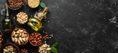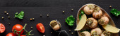 widok z góry pyszne gotowane ślimaki z cytryną i pęsetą na czarnym drewnianym stole, panoramiczne ujęcie