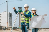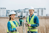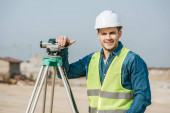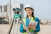 Uśmiechnięty geodeta z cyfrowym poziomem patrzący na kamerę na placu budowy