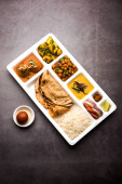 Indyjskie jedzenie wegetariańskie Thali lub paczka żywności taca z przedziałami, w których Malai Kofta, chole, Dal tarka, suche aloo sabji, chapati i ryż ze słodkim gulab jamun służył