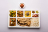 Indyjskie jedzenie wegetariańskie Thali lub paczka żywności taca z przedziałami, w których Malai Kofta, chole, Dal tarka, suche aloo sabji, chapati i ryż ze słodkim gulab jamun służył
