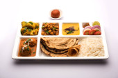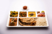 Zdjęcie "Indyjskie jedzenie wegetariańskie Thali lub paczka żywności taca z przedziałami, w których Malai Kofta, chole, Dal tarka, suche aloo sabji, chapati i ryż ze słodkim gulab jamun służył" może być wykorzystywane do celów osobistych i komercyjnych zgodnie z warunkami zakupionej licencji Royalty-free. Obraz jest dostępny do pobrania w jakości wysokiej rozdzielczości do 5760x3840.