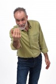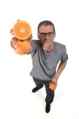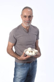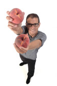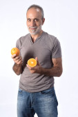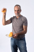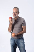 portret mężczyzny z pomidorami na białym tle