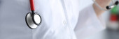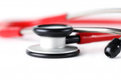 Czerwony stetoskop z odizolowaną czarną srebrną głowicą
