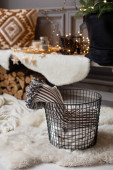 Zbliżenie papierni i dwóch pustych kubków na czarnym stole i jodły drewnianych desek na tle